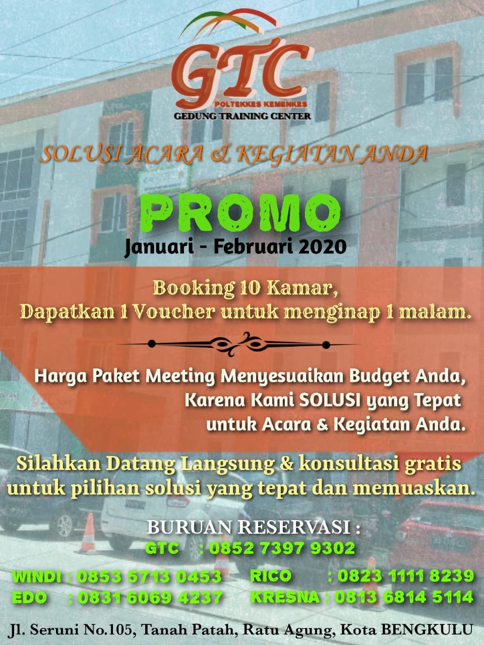 Realnewsbengkulu.com || Bengkulu -- Awal tahun 2020 GTC Poltekes Bengkulu yang beralamat di Jalan Seruni No.105 rt 015/rw 003  Tanah Patah kecamatan Ratu Agung kota Bengkulu memberikan promo menarik untuk . . . 0